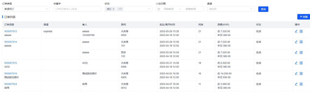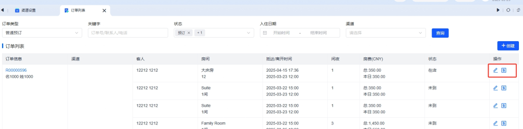 - 预订 :显示所有已确认但尚未入住的预订订单