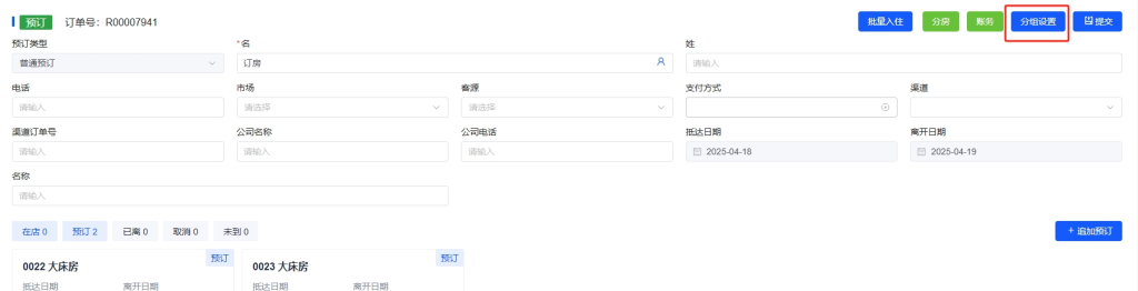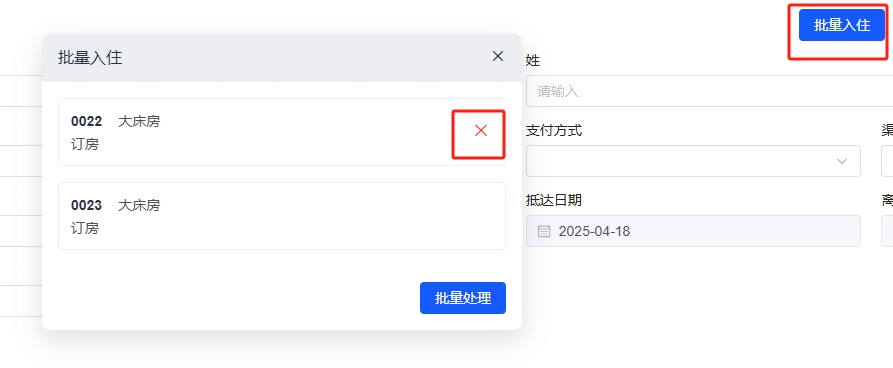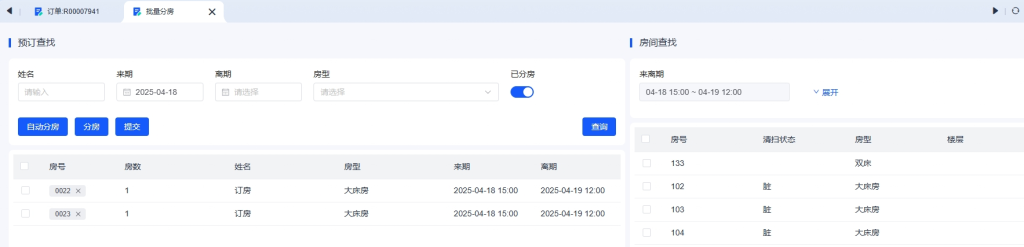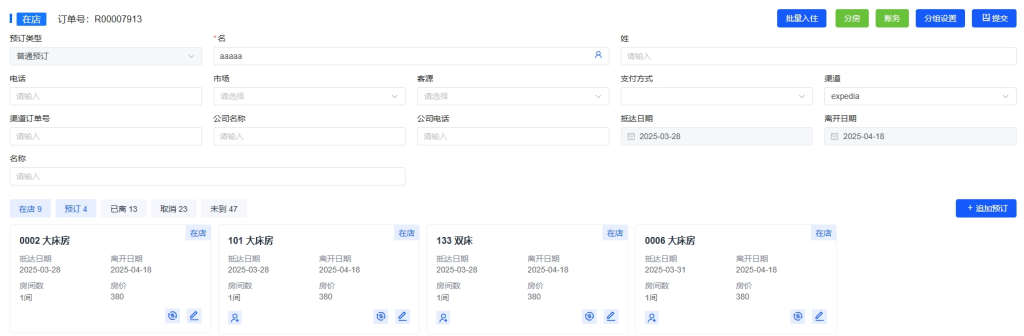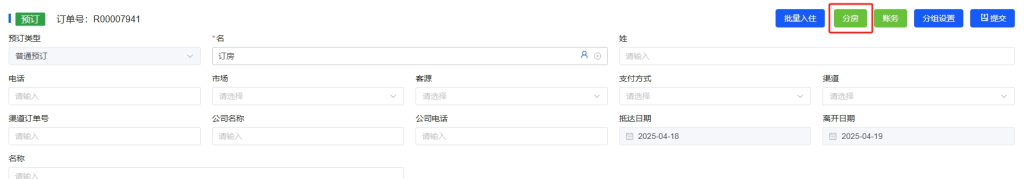 在订单编辑界面,可为已分房但未入住的预订办理批量入住: