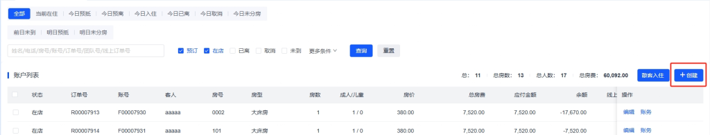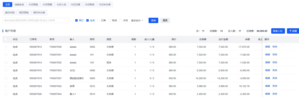 账户列表是酒店管理系统的核心功能模块,用于管理所有客人账户信息,包括预订、入住、退房等全生命周期管理。该功能提供强大的查询筛选能力,支持多种操作功能,帮助前台人员高效处理客人预订和入住业务,提升服务质量和工作效率。