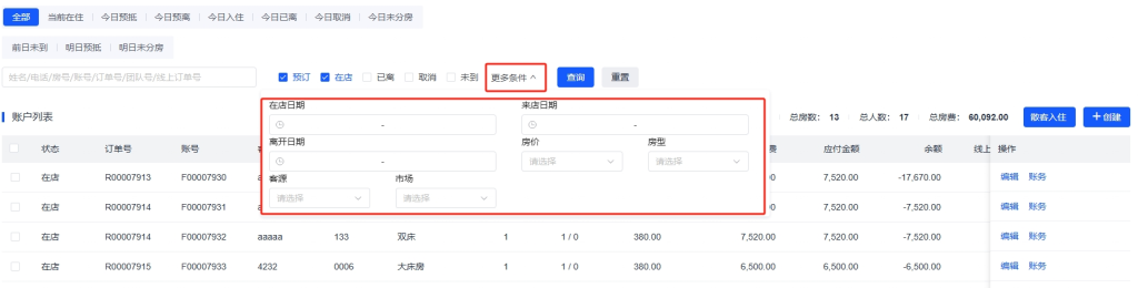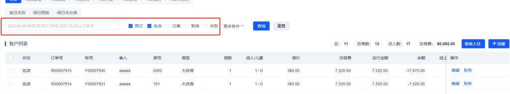 - 电话 :输入电话号码关键字,匹配订房人或入住人电话