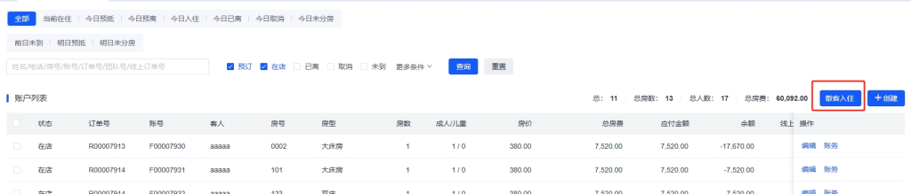 - 入住 :显示所有已办理入住的客人