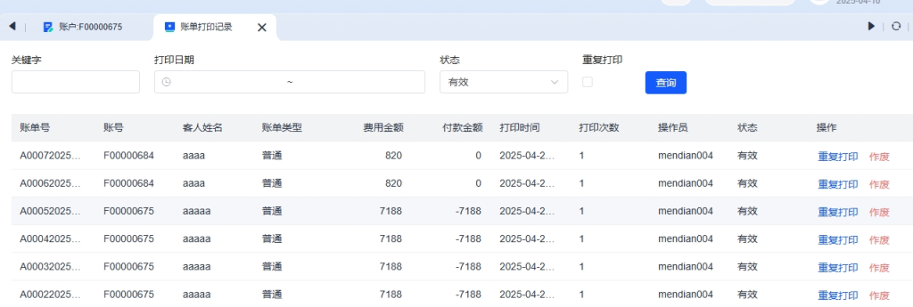 重复打印查询 :筛选已被重复打印的账单记录 - 列表显示