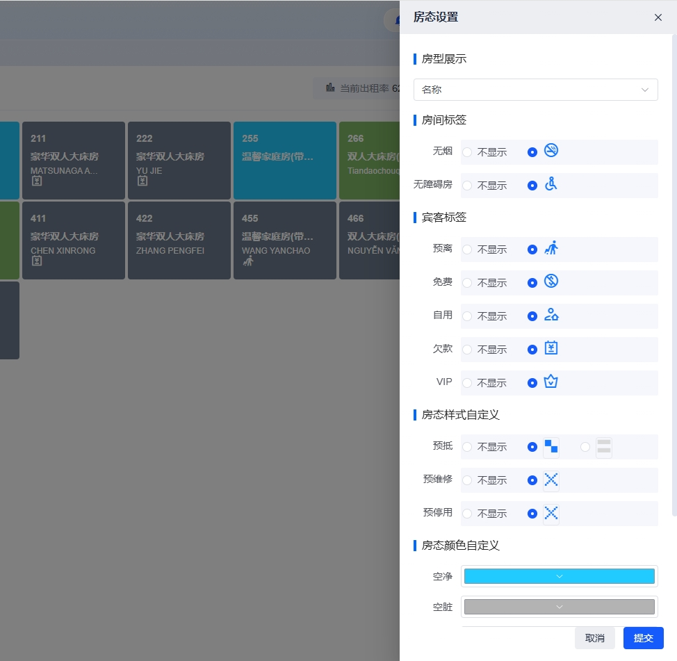 - 房态颜色设置会影响所有用户的显示效果,请谨慎修改
