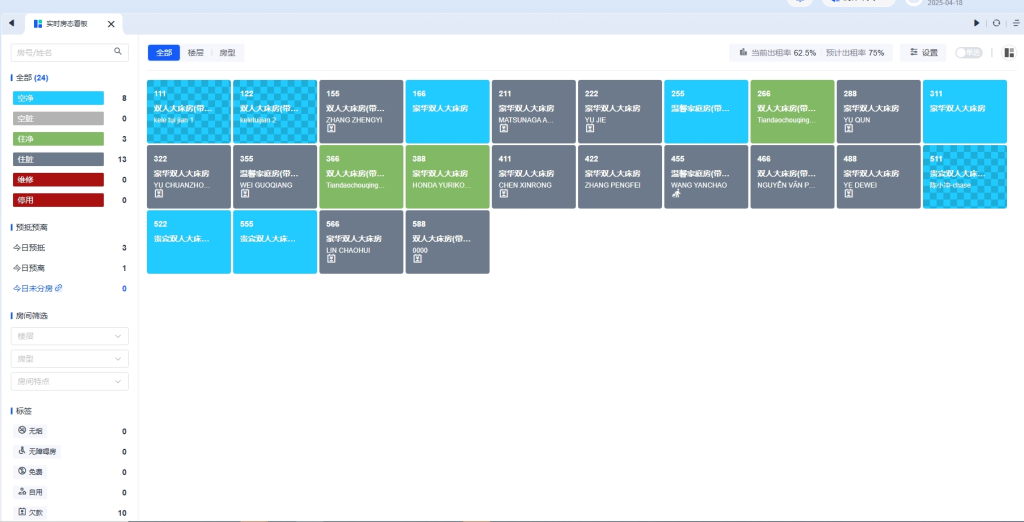 - 房态看板数据实时更新,反映最新的房间状态