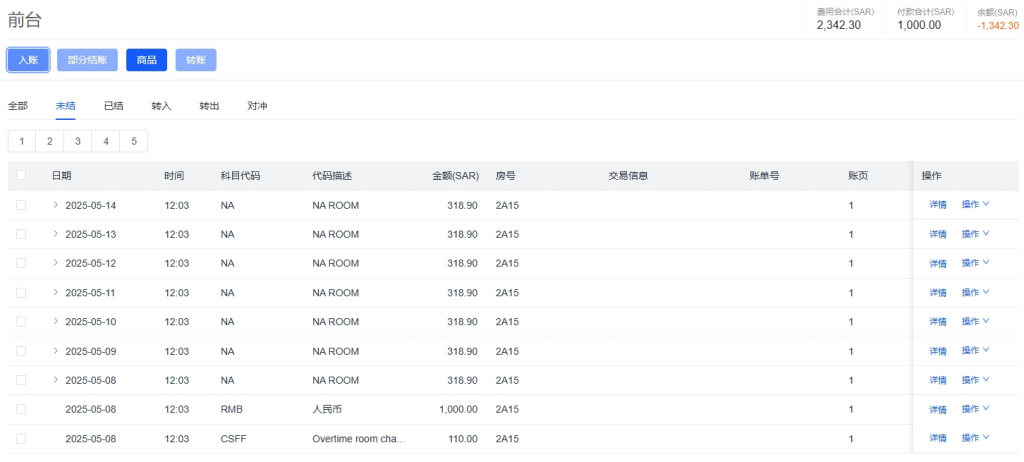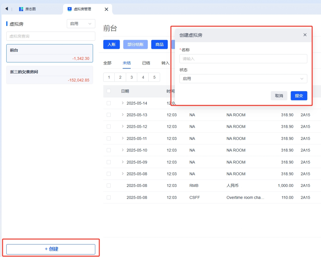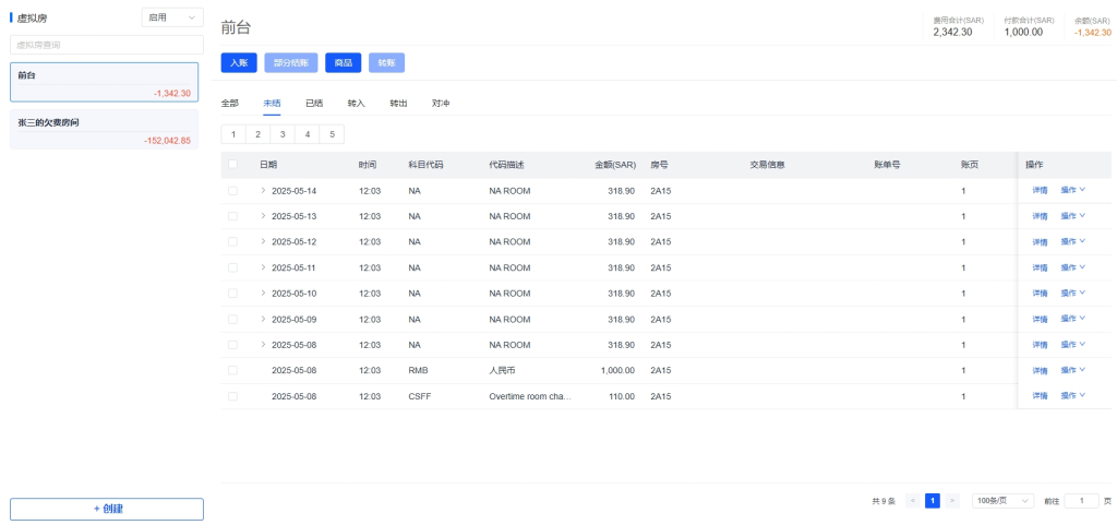 - 右侧:选中虚拟房的详细信息,包括账务汇总和操作按钮