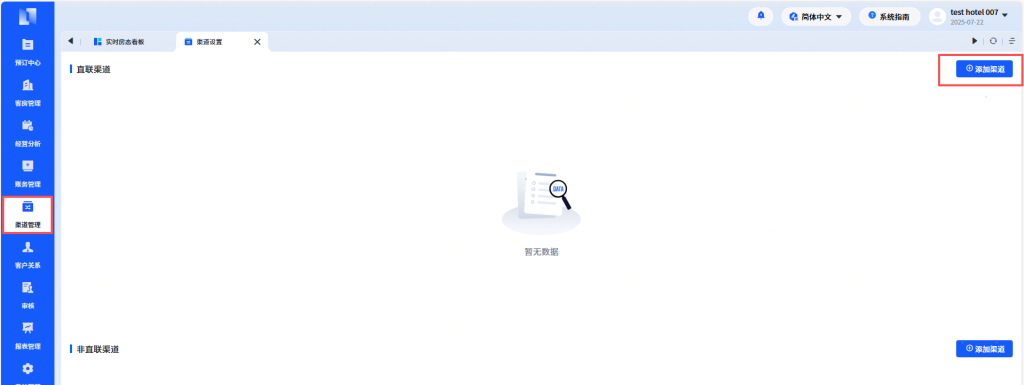 进入 PMS 系统【渠道管理】页面后,点击页面右上角的【添加渠道】按钮。
