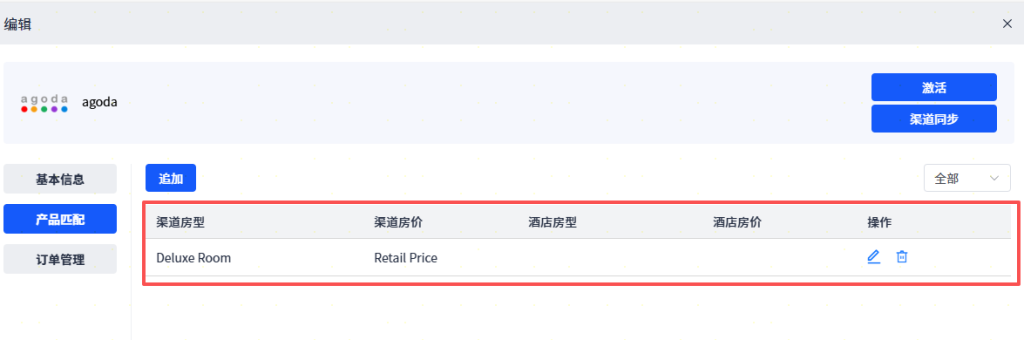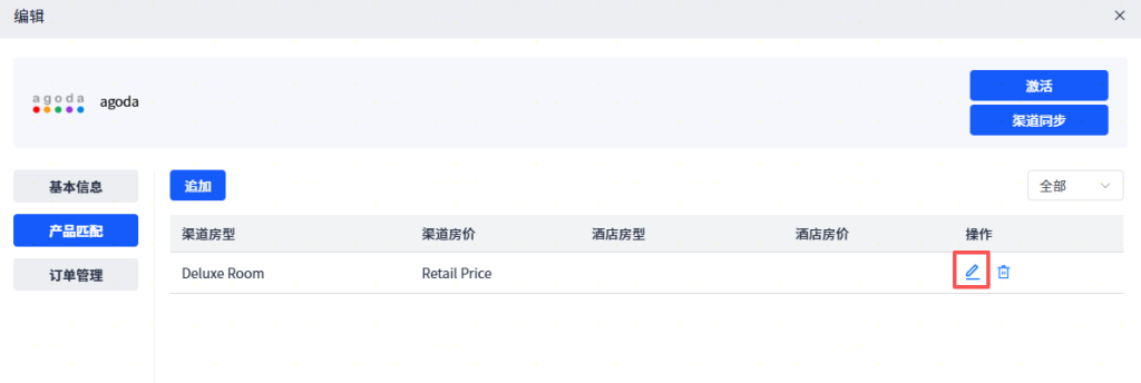 产品匹配:页面显示 “Agoda 渠道产品” 列表(同步自 Agoda 后台)。点击产品【编辑】按钮,在弹出页面设置渠道产品和PMS系统中的房型和房价计划关系后, 点击【确认】按钮,完成匹配操作。