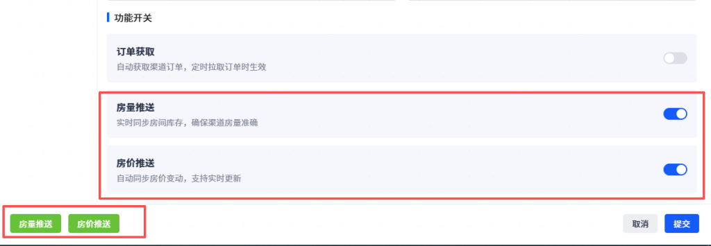 在 Agoda 渠道管理基本信息页中,找到 “功能开关” ,开启 “房量推送” 和 “房价推送” 两个功能开关(开关显示为 “蓝色” 表示已开启)。