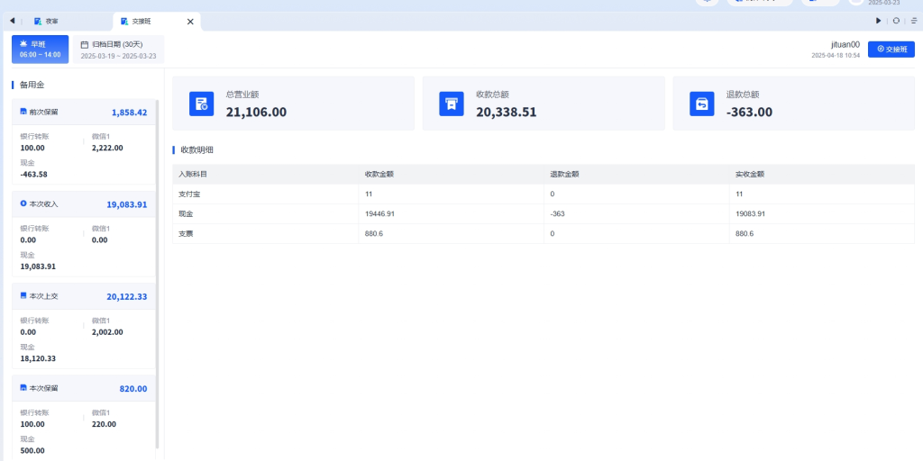 在交接班界面,系统自动显示按入账科目分组的收款明细: